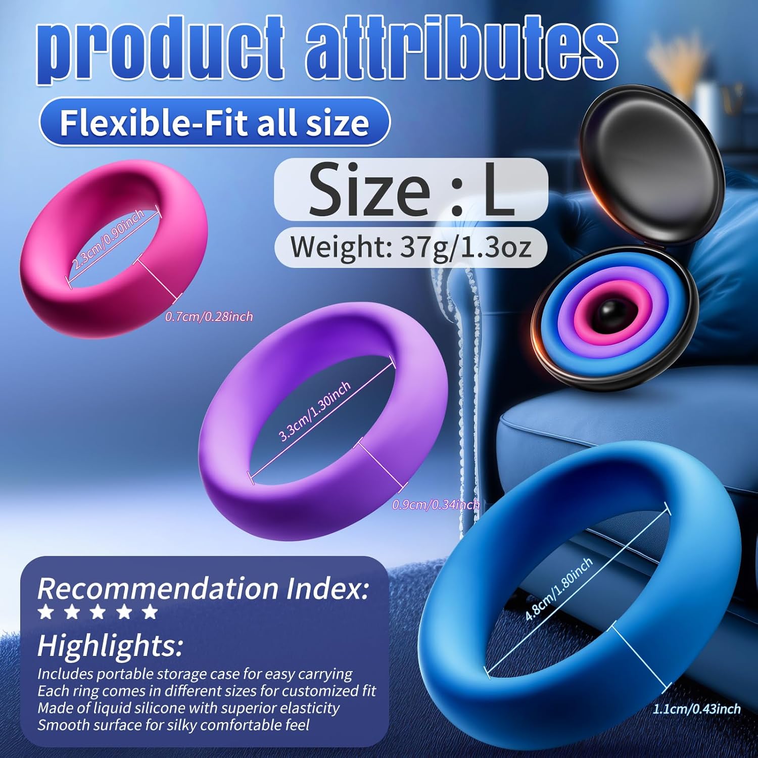 3 Pcs of Colored Sex Toys: This set includes three different colors and sizes of penis rings. Made from high-elasticity, soft, and comfortable materials, these rings can withstand up to 85kg of tension, ensuring stability and comfort while enhancing erection duration. The silicone cock rings come in various sizes, each offering a different level of elasticity and pressure.